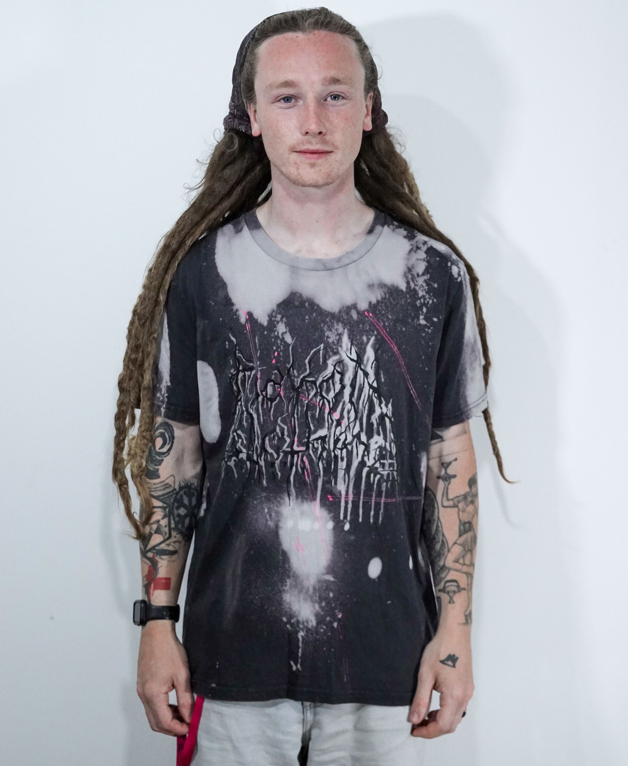 Hand bleached, then ink splatered (pink/green etc) then printed using black DTF prints.